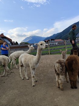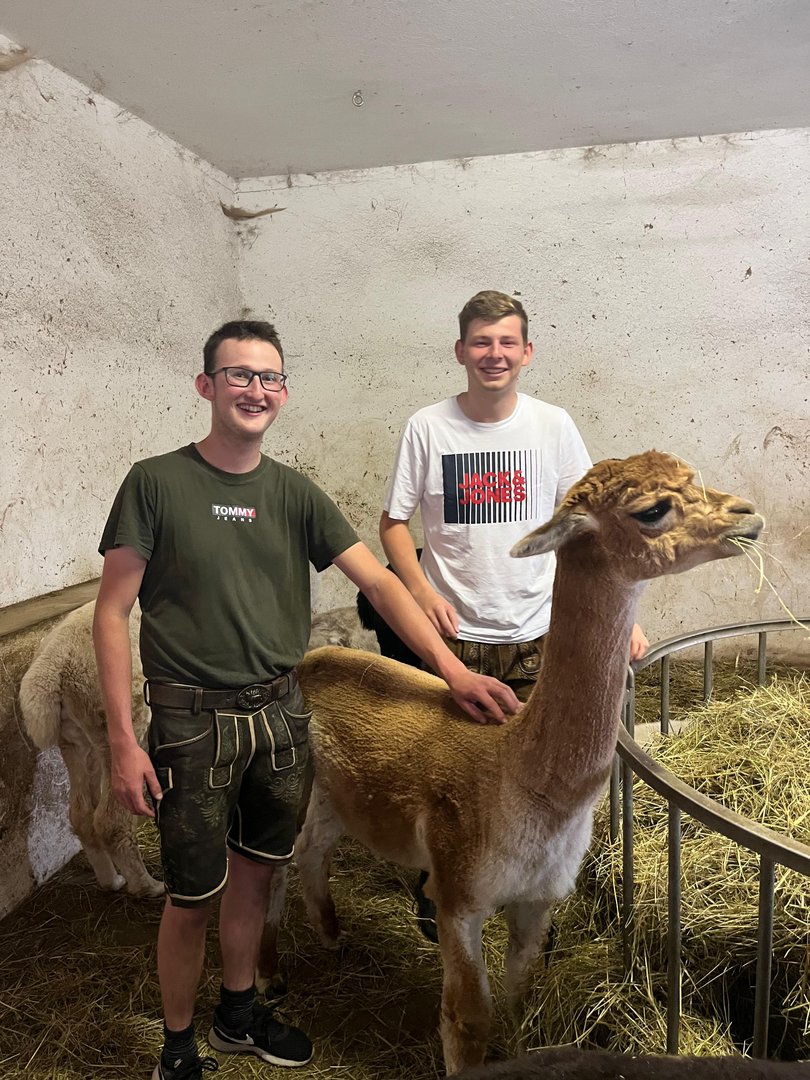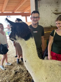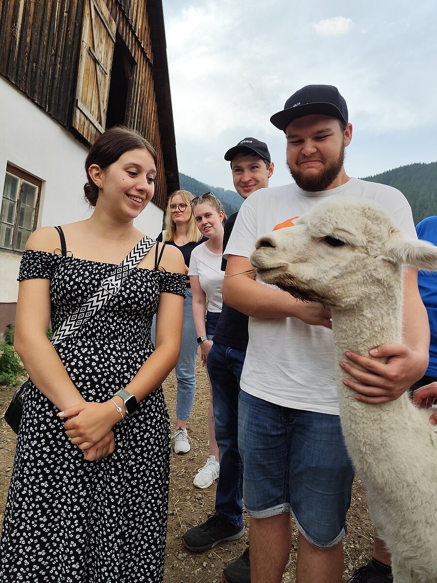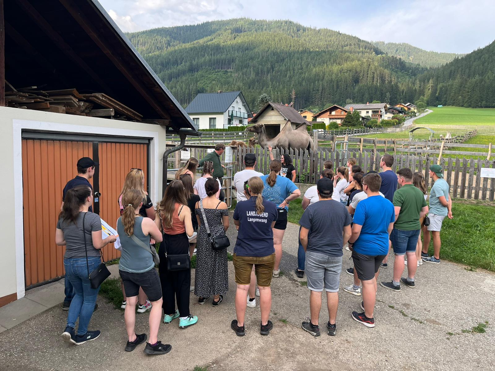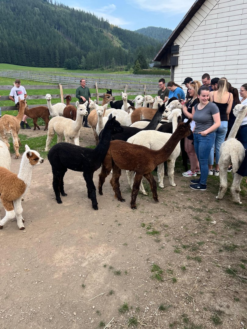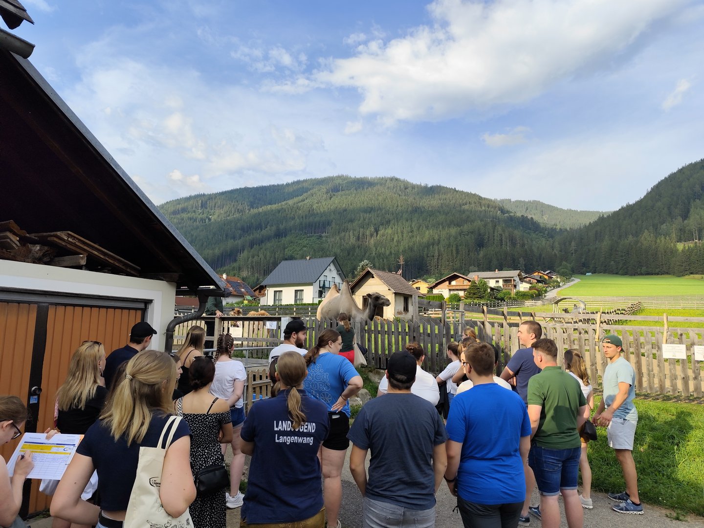 Am Dienstag, dem. 9. Juli, besichtigten 30 Landjugend-Mitglieder aus den Bezirken Bruck/Mur, Mürzzuschlag und Leoben den Pattererhof der Familie Friedam/Kaufmann in Tragöß. Zu besichtigen gab es dort so einiges. Angefangen mit 3 Kamelen, davon ein noch sehr junges Trampeltier namens Karl. Auch die zwei Hängebauchschweine haben sich bei unserem Besuch zeigen lassen. Weiter ging es dann auch sofort in den Stall der Alpakas und Lamas. Um die 50 Tiere tummelten sich im Stall herum und wir durften die Stuten füttern. Ein weiteres großes Highlight war auf jedenfall der kurze Spaziergang zu den zwei Rentieren. Cupid und Comet zeigten sich in ihrer vollen Pracht und hatten ebenfalls keine Scheu vor Besuchern. Zum Abschluss durften wir die männlichen Alpakas mit Streicheleinheiten verwöhnen.