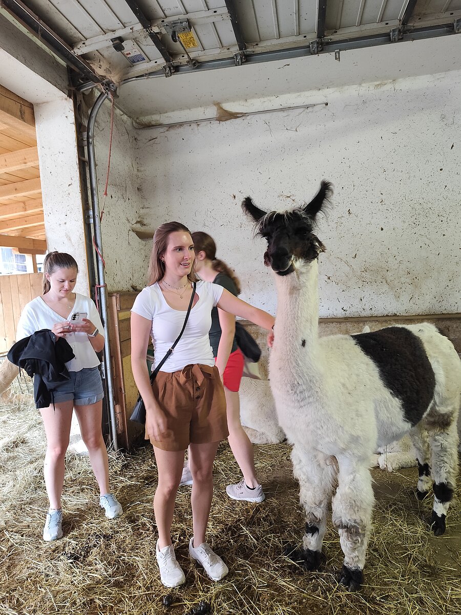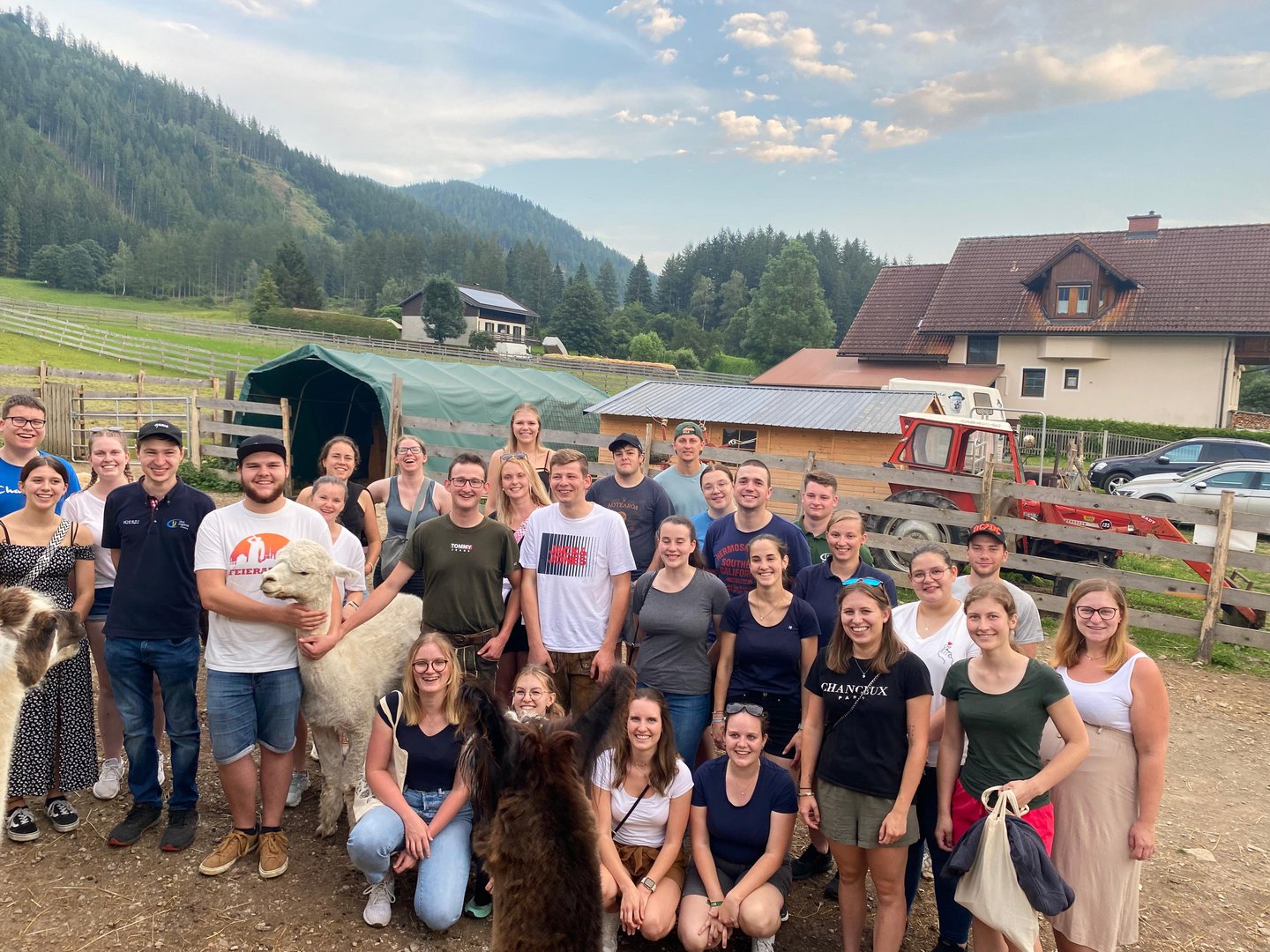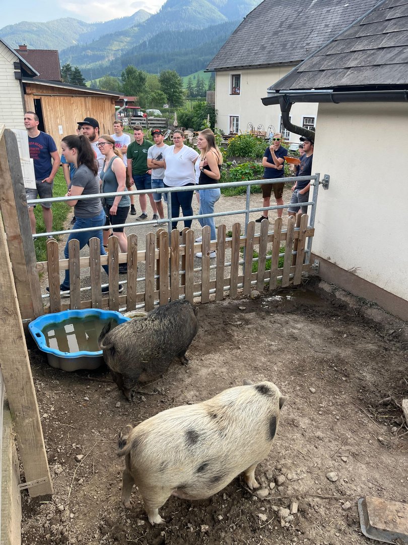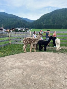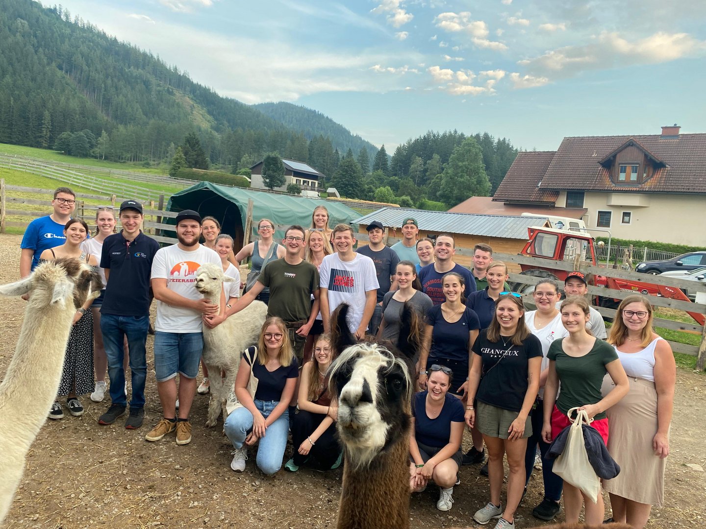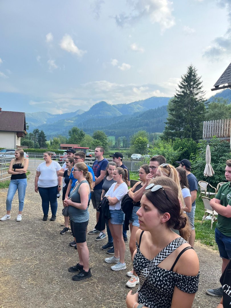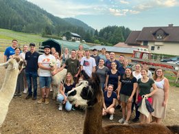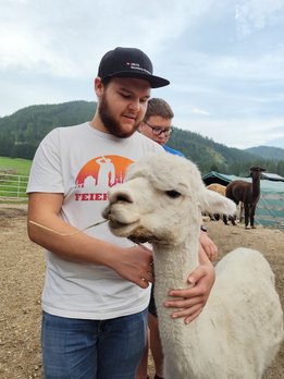Am Dienstag, dem. 9. Juli, besichtigten 30 Landjugend-Mitglieder aus den Bezirken Bruck/Mur, Mürzzuschlag und Leoben den Pattererhof der Familie Friedam/Kaufmann in Tragöß. Zu besichtigen gab es dort so einiges. Angefangen mit 3 Kamelen, davon ein noch sehr junges Trampeltier namens Karl. Auch die zwei Hängebauchschweine haben sich bei unserem Besuch zeigen lassen. Weiter ging es dann auch sofort in den Stall der Alpakas und Lamas. Um die 50 Tiere tummelten sich im Stall herum und wir durften die Stuten füttern. Ein weiteres großes Highlight war auf jedenfall der kurze Spaziergang zu den zwei Rentieren. Cupid und Comet zeigten sich in ihrer vollen Pracht und hatten ebenfalls keine Scheu vor Besuchern. Zum Abschluss durften wir die männlichen Alpakas mit Streicheleinheiten verwöhnen.