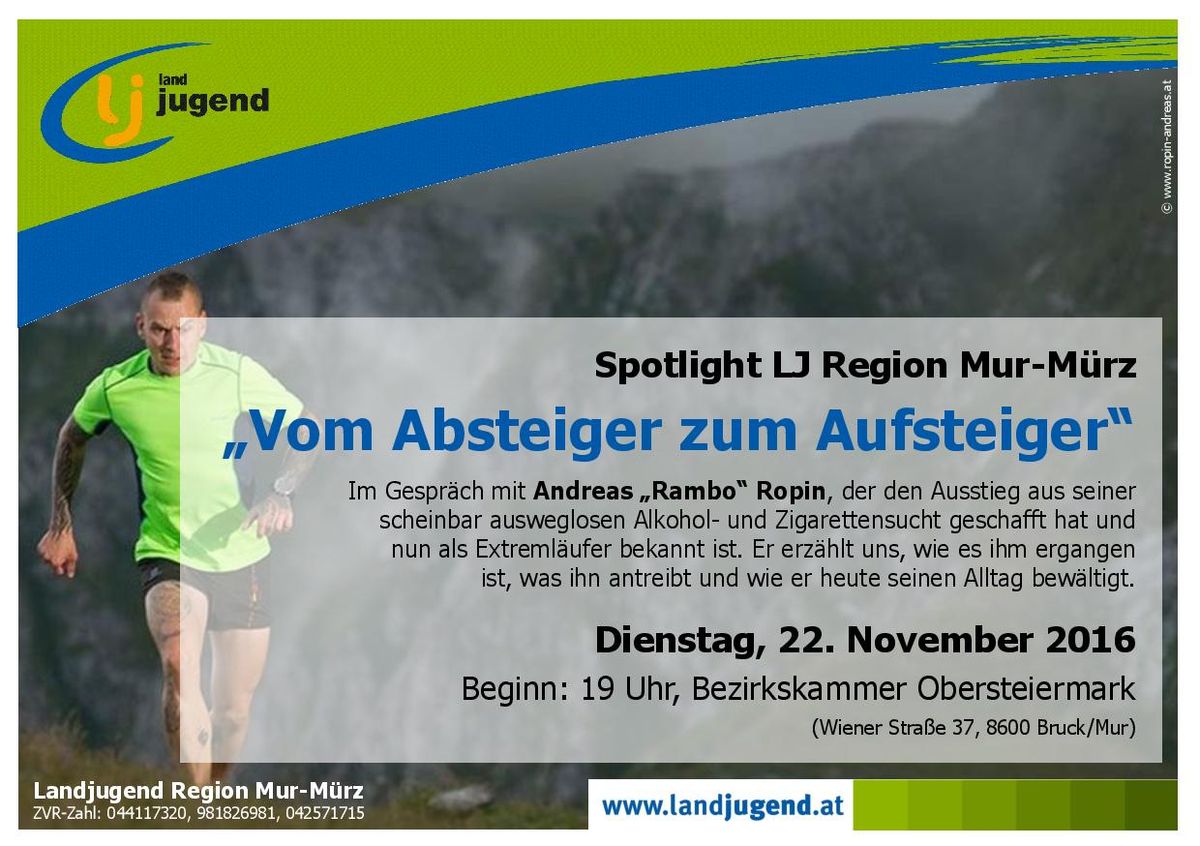 Früher stand er knapp vor dem Ruin: arbeitslos, schwerster Alkoholiker, Kettenraucher. Heute ist er einer der bekanntesten Extremsportler unserer Region. Andreas „Rambo“ Ropin erzählt uns von seinem Abstieg in die Alkohol- und Zigarettensucht, von seinem Absprung in letzter Sekunde und wie es ihm heute geht. Sei dabei beim Spotlight der LJ-Region Mur-Mürz mit Extremsportler Andreas "Rambo" Ropin am 22. November um 19 Uhr in der Bezirkskammer Obersteiermark!