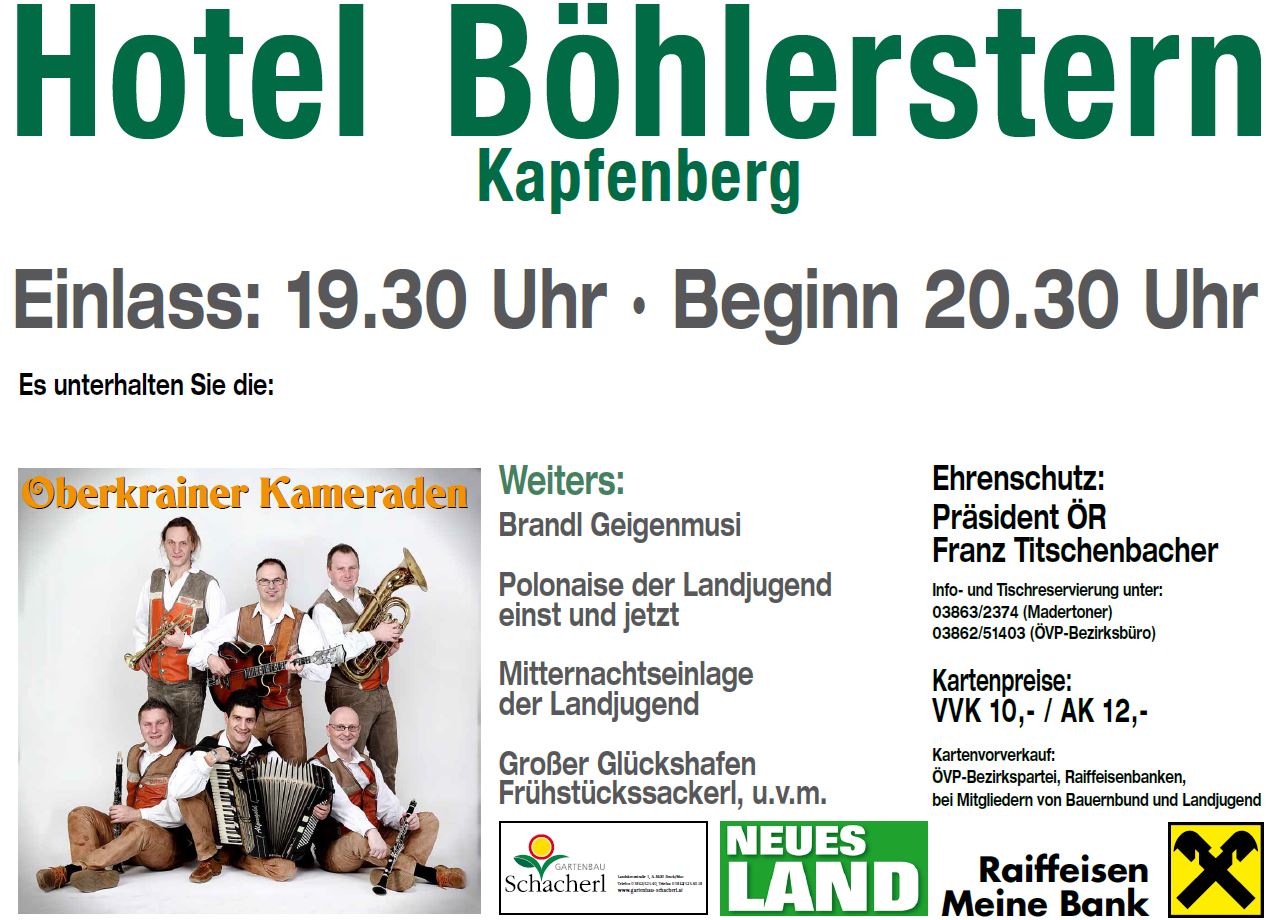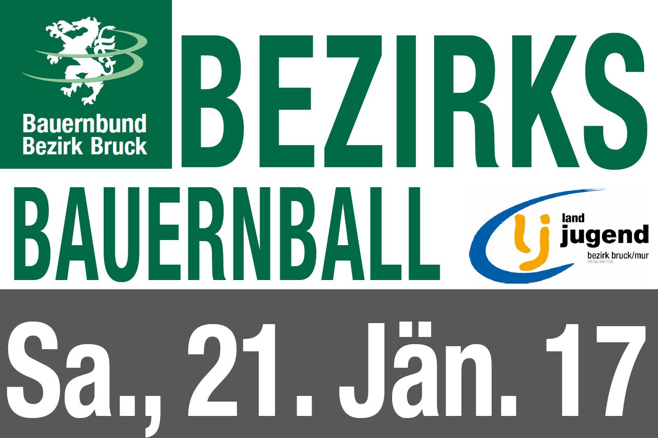Am Samstag, dem 21. Jänner 2017 findet der traditionelle Bezirksbauernball statt. Bauernbund und Landjugend Bezirk Bruck/Mur sorgen im stilvollen Ambiente des Hotels Böhlerstern in Kapfenberg für eine rauschende Ballnacht. Die Highlights des Abends sind die gemeinsame Polonaise von Landjugend und Bauernbund, die Mitternachtseinlage und ein großer Glückshafen. Im Saal heizen die "Oberkrainer Kameraden" den Gästen auf der Tanzfläche ordentlich ein. Die "Brandl Geigenmusi" sorgt für sanftere, steirische Klänge in der Wein- und Sektbar. Und in der Disco legt DJ Karl-Heinz für alle Jungen und Junggebliebenen auf. Komm vorbei! Wir freuen uns auf DICH!