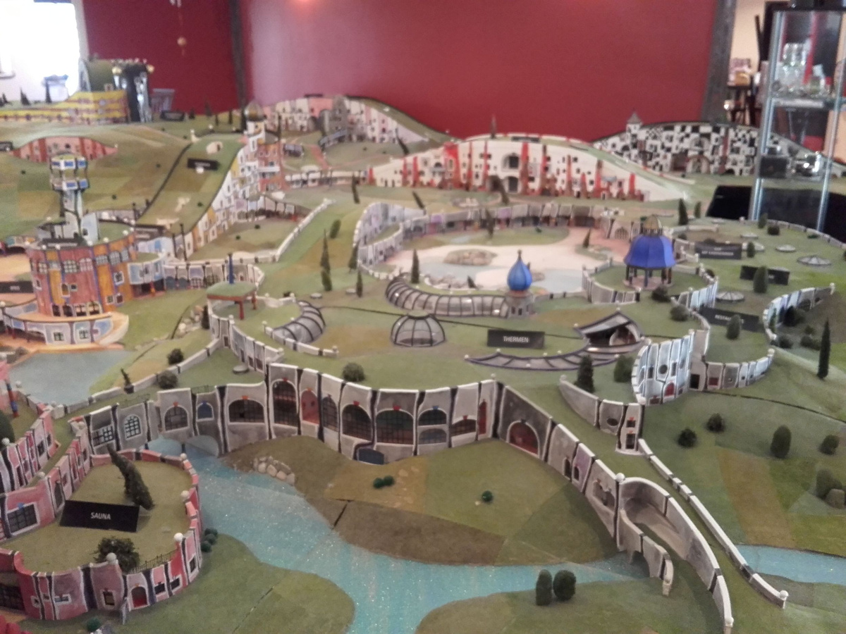 Auch das Arbeitsmodell wurde uns gezeigt. Darauf ist zu erkennen, dass weitere Augenschlitzhäuser und ein Schneckenhaus in Planung sind.