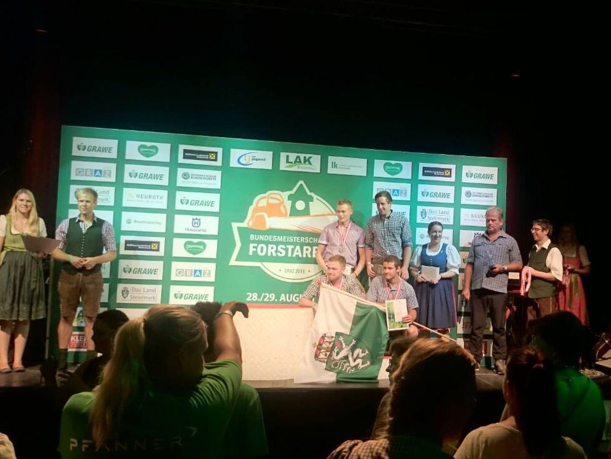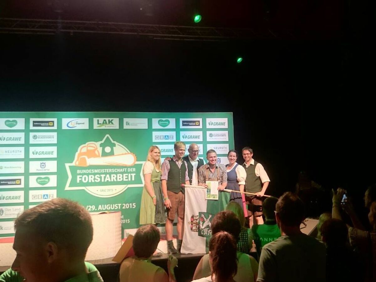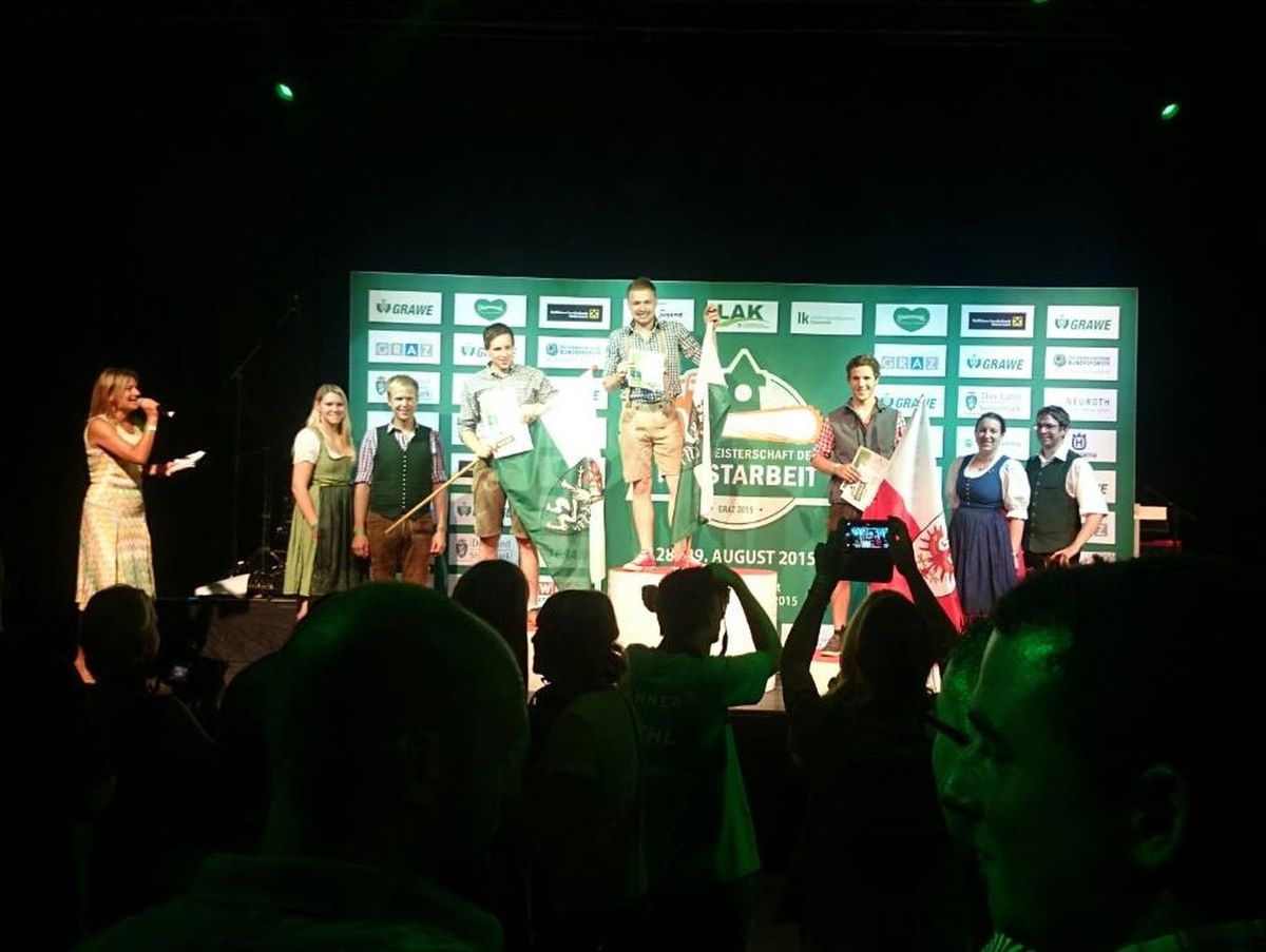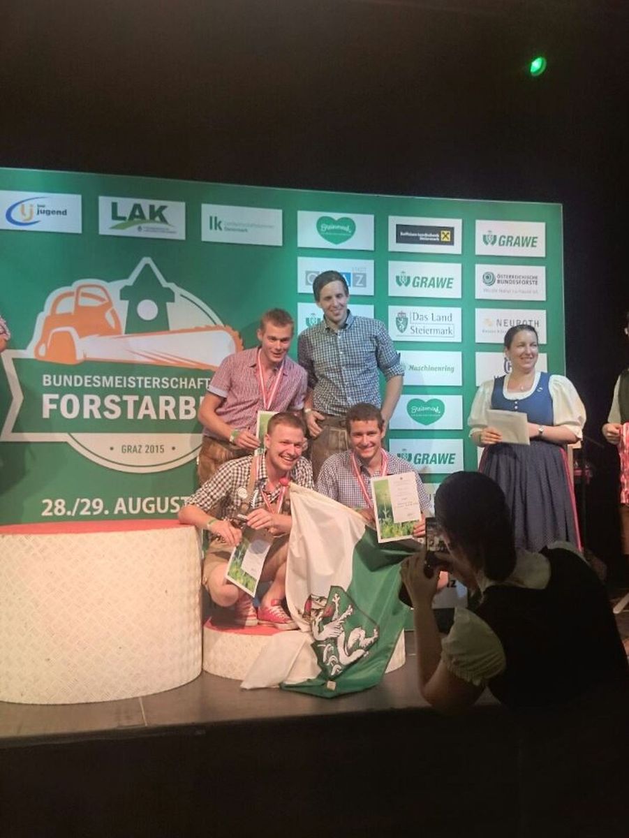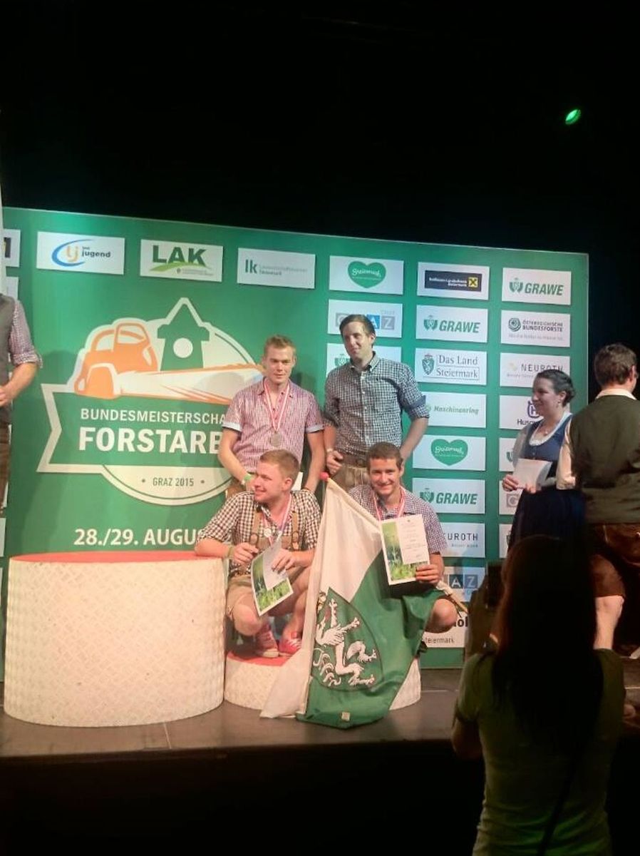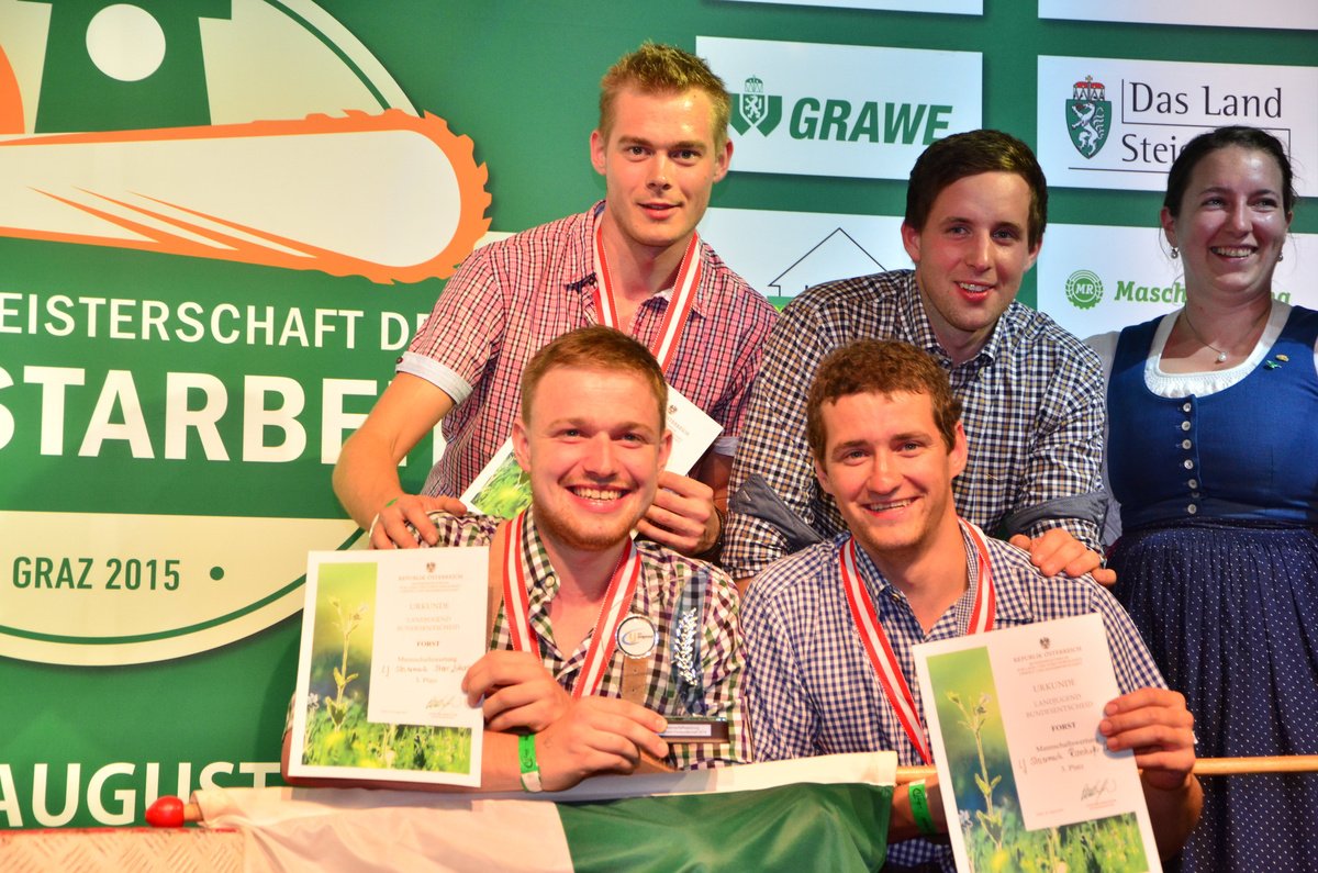 Nach einer Unmenge an Vorbereitungen ging am 28. und 29. August der Bundesentscheid Forst auf dem Grazer Hauptplatz über die Bühne. Das steirische Team bestehend aus Christian Rinnhofer und Christoph Pusterhofer aus dem Nachbarbezirk, sowie unseren beiden Bruckern Lukas Steer (LJ St. Katharein) und Johannes Meisenbichler (LJ Kapfenberg) konnte betrachtliche Ergebnisse erreichen. Hinter Kärnten und Tirol holten sie sich den hervorragenden dritten Platz in der Teamwertung. Die Einzelmedaillen unserer beiden Forstwettkämpfer sprechen für sich. Lukas Steer erkämpfte sich zwei Goldmedaillen (Theorieteil und Fallkerb- & Fällschnitt) und eine Bronzemedaille (Kettenwechsel). Auch Johannes Meisenbichler holte sich einmal Gold (Präzisionsschnitt) einmal Silber (Fallkerb- & Fällschnitt) und einmal Bronze (Kombinationsschnitt). Komplettiert wurden die steirischen Medaillen durch den 2.Platz im Theorieteil durch Christoph Pusterhofer. In der Gesamtwertung erreichte Lukas Steer den undankbaren 4. Platz. Johannes Meisenbichler landete auf dem 14. Platz. Wir gratulieren unseren beiden Motorsägen-Profis, sowie dem gesamten steirischen Team zu ihren hervorragenden Leistungen! Weitere Fotos, ausführliche Berichte und alle Ergebnisse findet ihr unter www.graz2015.at, auf der Homepage der Landjugend Steiermark und der Landjugend Österreich.