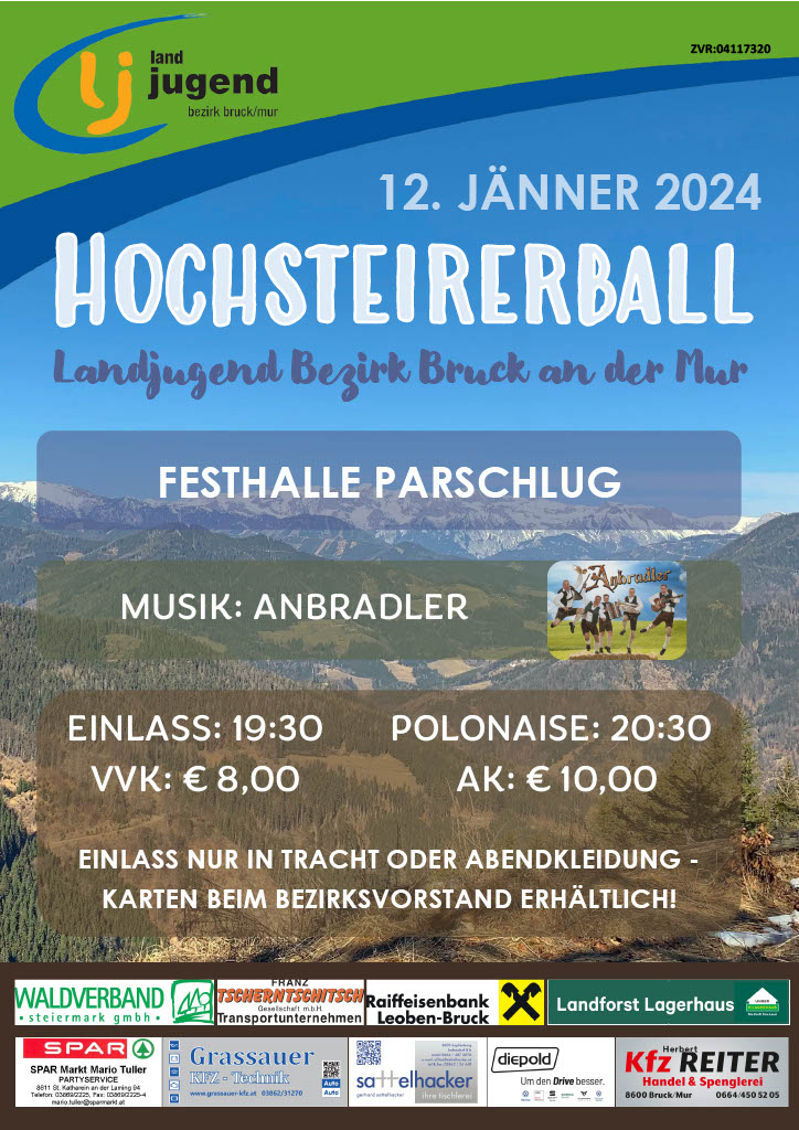 Am 12.Jänner war es wieder soweit und wir, der Bezirksvorstand Bruck Mur, haben den alljährlichen Hochsteirerball veranstaltet. Mit der Unterstützung all unserer Ortsgruppen konnten wir diesen Abend auf die Beine stellen. Den Abend eröffnete die Landjugend Mariazell-Ötscherland mit einer Polonaise. Anschließend durften unsere Leiterin Barbara Ofenluger und Obmann Martin Krenn unsere Gäste Herzlich willkommen heißen.
