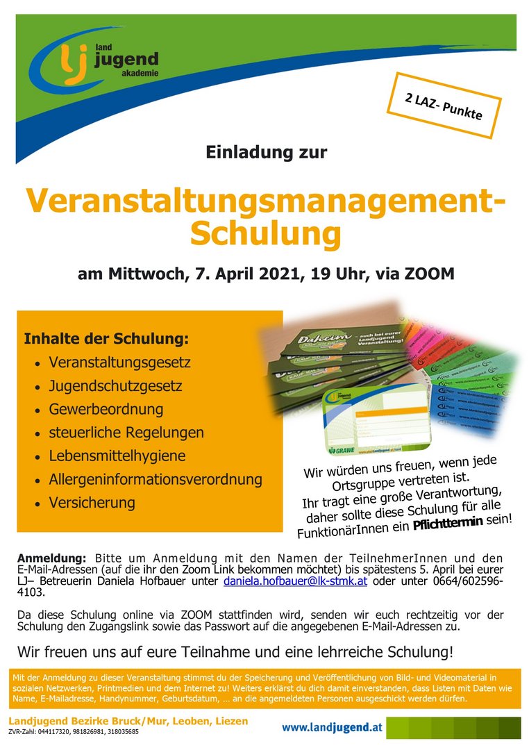 Wir freuen uns auf eure Teilnahme und bitten euch um Anmeldung bis spätestens 5. April bei unserer Betreuerin Daniela Hofbauer unter 0664/602596-4103 oder daniela.hofbauer@lk-stmk.at.