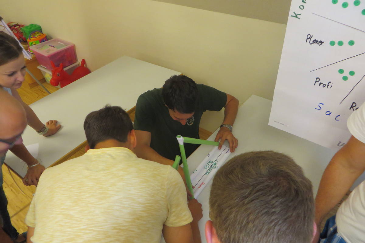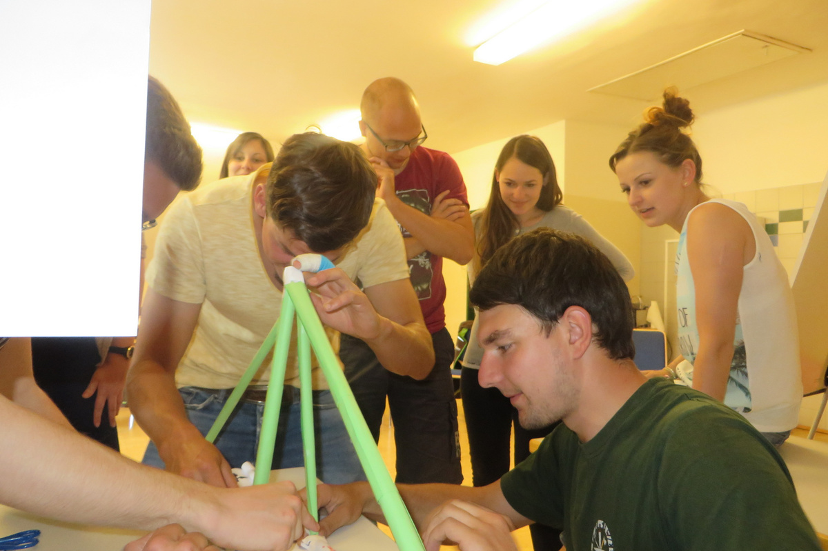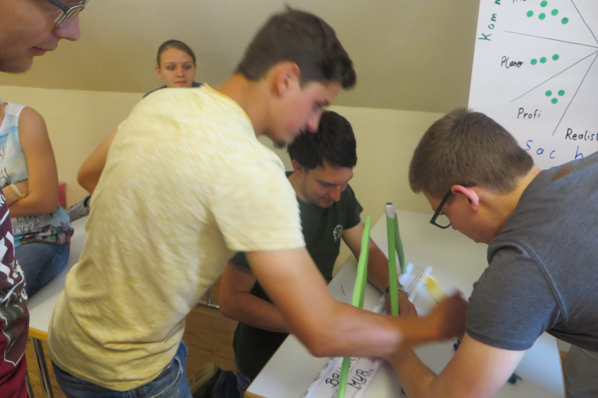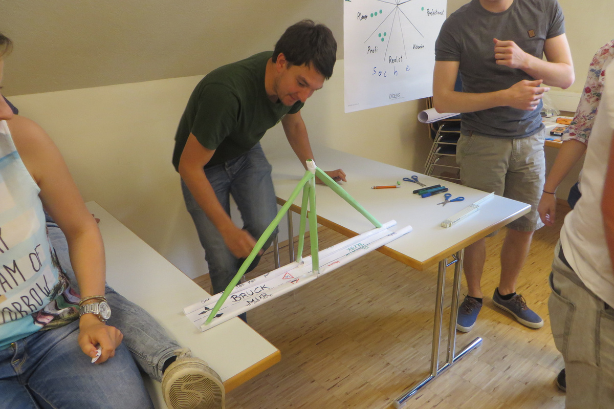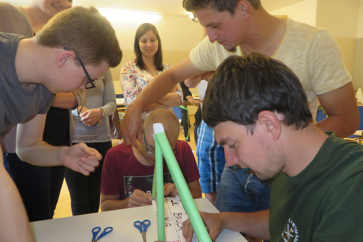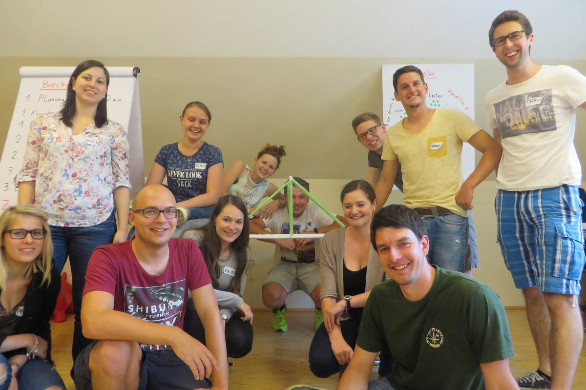 Um 8 Uhr starteten wir im Gemeindezentrum Tragöß - St. Katharein mit unserer Vorstandsklausur. Unser Regionalbetreuer und LJ-Trainer Josef Sauseng hatte viele interessante Dinge für uns vorbereitet. Im Freien machten wir einige Aktivierungsübungen und versuchten unter anderem auch den Gordischen Knoten zu entwirren. Die Vorstellrunde fand im Zuge einer Anzeige statt, die jeder über sich selbst verfasste - an Kreativität wurde natürlich nicht gespart. Mit Hilfe eines Persönlichkeitstests stellten wir auch unsere Rollen im Team fest. Man kann wirklich sagen, dass unsere Rollenverteilung annähernd perfekt funktioniert. Vor dem Mittagessen machten wir uns noch Gedanken über Grußworte, die wir bei diversen Generalversammlungen unserer Ortsgruppen verwenden könnten. Darauf folgte natürlich auch der große Auftritt, bei dem wir unsere persönlichen Grußworte zum Besten gaben, und uns dem Feedback zwei unserer Vorstandskollegen stellten. Am Nachmittag stand dann die Lösung des Rätsels rund um den Obelisken Zin auf dem Programm, was kein großes Problem darstellte. Zum Abschluss stellten wir noch unsere baulichen Fähigkeiten unter Beweis. Aufgeteilt in zwei Gruppen war es unsere Aufgabe, jeweils eine Brückenhälfte zu bauen, die dann zum Schluss mit der anderen zusammengebaut werden sollte. Neben den Bauphasen gab es immer wieder Koordinationstreffen, bei dem sich die beiden Bauleiter besprechen und austauschen konnten. Genaue Maße, Ausführungen und Gestaltung wurden so untereinander abgestimmt. Nach dem erfolgreichen Zusammenbau testeten wir natürlich die Standfestigkeit unseres Bauwerks. Über vier Kilogramm konnten wir schlussendlich auf die Brücke legen, ohne dass sie zusammenbrach. Diese Brücke symbolisiert in gewisser Weise auch unser Bezirksvorstandsteam. Gemeinsam schaffen wir fast alles, wenn wir uns gegenseitig stützen und uns aufeinander verlassen können. Durch diese Klausur haben wir uns gegenseitig wieder ein Stück besser kennengelernt, und sind weiter zusammengewachsen. Danke Josef, für die hervorragende Vorbereitung, es waren für jeden viele neue Sachen dabei!